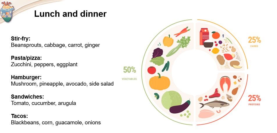 Make sure half your lunch and dinner plate is fresh veg, salad or legumes. (Don’t worry about the presence of calcium chloride or sulphites if you like the convenience of canned legumes because the benefits of the legumes far outweigh any theoretical risk of the additives which based on current data is non-existent).